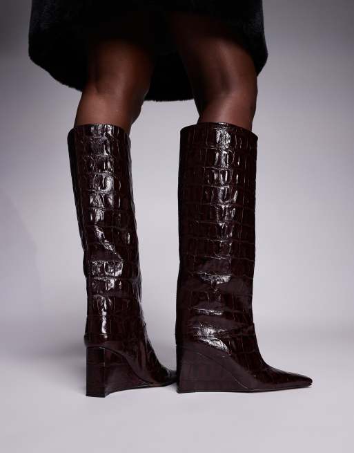 ASOS DESIGN - Clarissa - Bottes à enfiler en cuir de qualité supérieure à semelle compensée et bout biseauté - Bordeaux croco