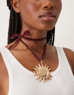 ASOS DESIGN - Collier avec ruban bordeaux et pendentif soleil oversize - Doré
