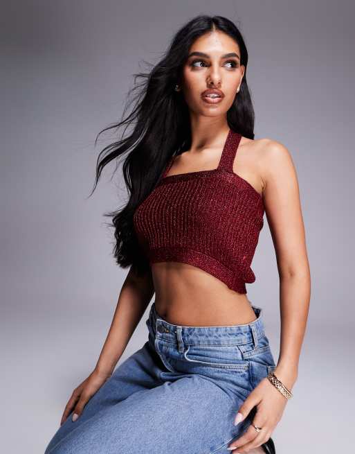 ASOS DESIGN - Crop top dos nu en maille à fils métallisés - Bordeaux