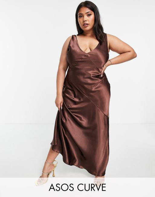 ASOS DESIGN Curve - Robe nuisette mi-longue coupée en biais effet satiné - Chocolat