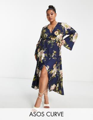 ASOS DESIGN Curve - Robe portefeuille en satin coupée en biais et nouée à la taille - Bleu marine fleuri