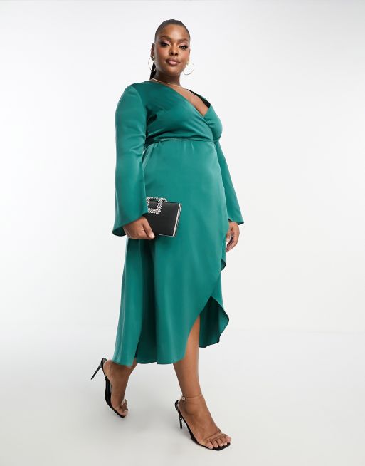 ASOS DESIGN Curve - Robe portefeuille nouée à la taille en satin coupé en biais - Sarcelle
