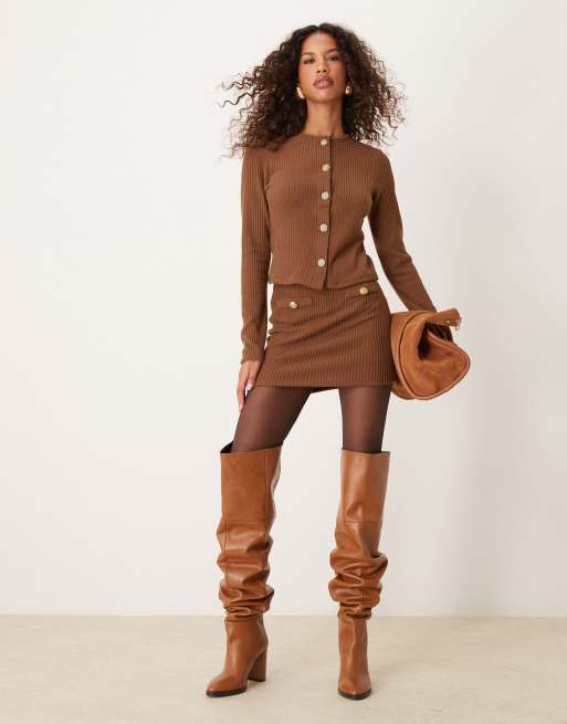 ASOS DESIGN - Ensemble côtelé effet brossé avec mini-jupe et gilet à manches longues - Chocolat