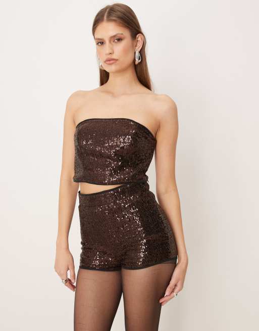 ASOS DESIGN - Ensemble élégant avec mini-short et top bandeau ornés de sequins - Chocolat