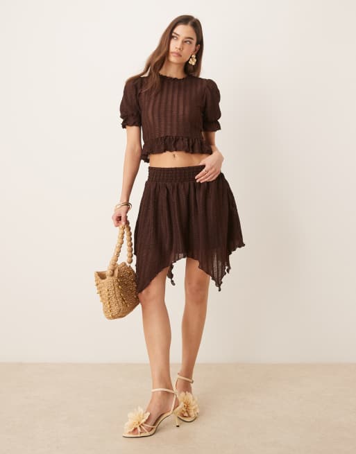 ASOS DESIGN - Ensemble en maille texturée avec top manches courtes dos nu et mini-jupe - Marron