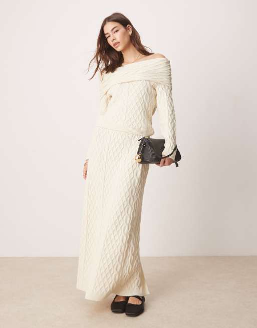ASOS DESIGN - Ensemble en maille torsadée avec jupe longue et pull à encolure Bardot - Crème