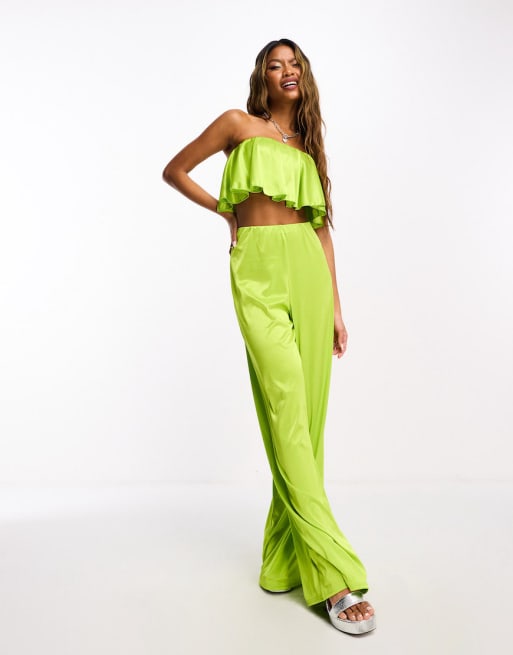 ASOS DESIGN - Ensemble en satin avec top bandeau et pantalon ample - Chartreuse