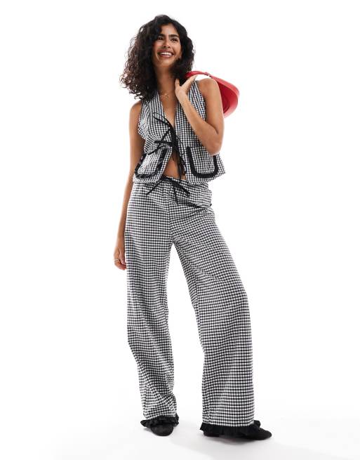 ASOS DESIGN - Ensemble gilet de costume noué devant avec poche à volants et pantalon - Vichy noir