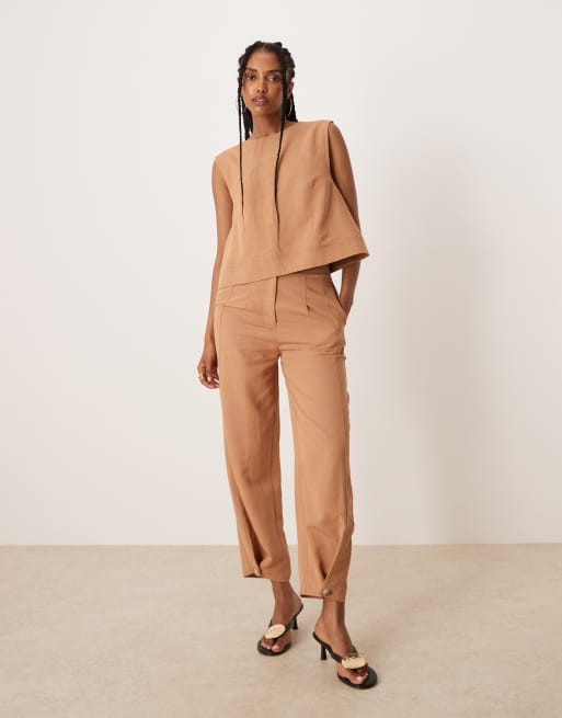 ASOS DESIGN - Ensemble pantalon habillé en lin avec ourlet à patte de boutonnage et top ajusté à col montant - Fauve