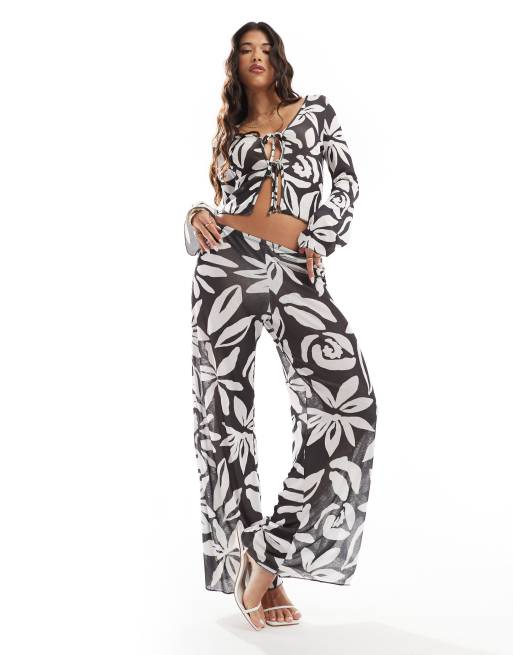 ASOS DESIGN - Ensemble pantalon large et top noué devant à manches évasées en tulle texturé - Imprimé fleurs noir et blanc