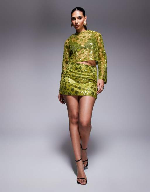 ASOS DESIGN - Ensemble top dos nu et mini-jupe en maille au crochet à manches longues avec fleurs à sequins