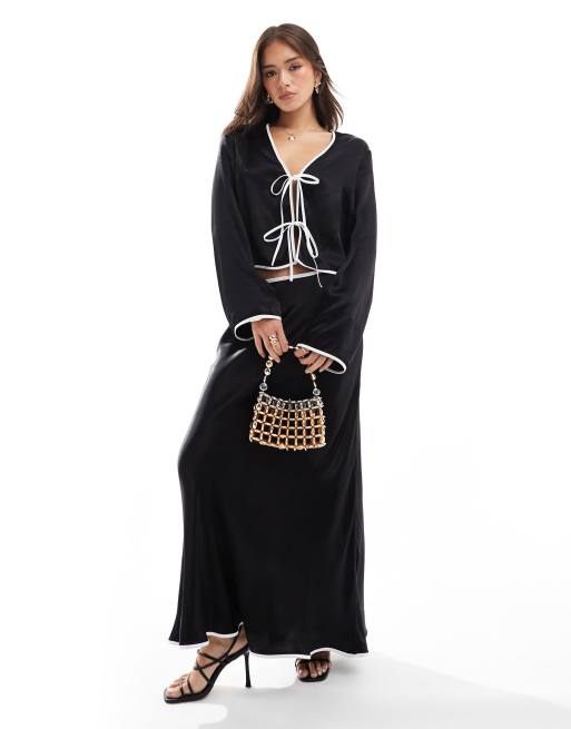 ASOS DESIGN - Ensemble top en satin avec liens contrastants et jupe longue - Noir