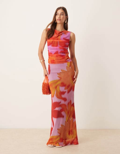 ASOS DESIGN - Ensemble top oversize en tulle à imprimé tropical et encolure bateau et jupe longue - Orange