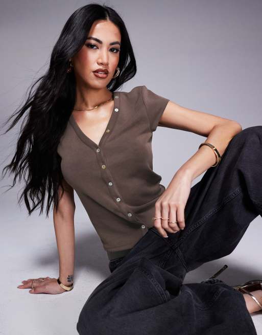 ASOS DESIGN - Gilet boutonné en cupro à manches courtes - Chocolat