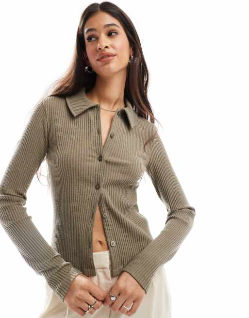 ASOS DESIGN - Gilet court ultra doux côtelé avec col - Taupe chiné