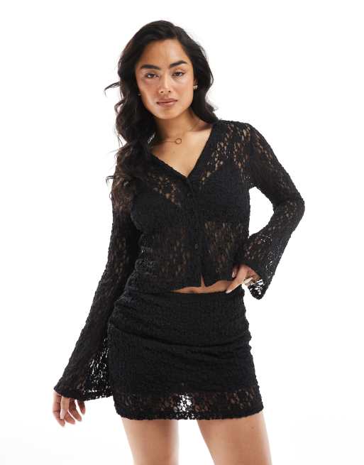 ASOS DESIGN - Gilet d'ensemble en dentelle à manches longues évasées - Noir