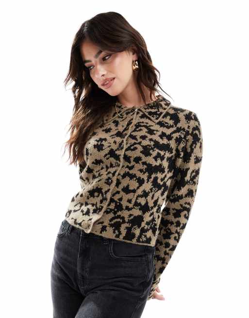 ASOS DESIGN - Gilet en maille imprimé léopard avec col - Moka