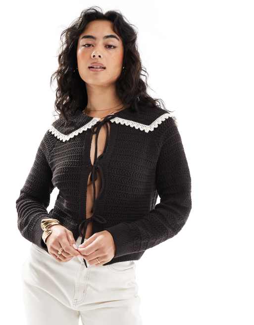 ASOS DESIGN - Gilet en maille noué sur le devant avec col et surpiqûres - Chocolat