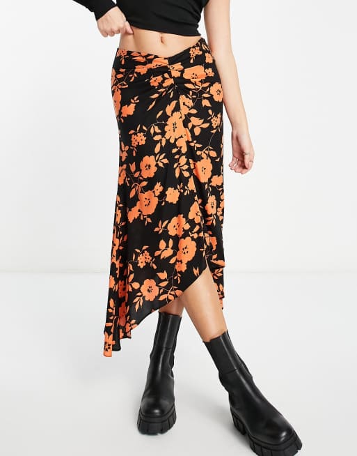 ASOS DESIGN - Jupe froncée mi-longue à imprimé fleuri orange vif