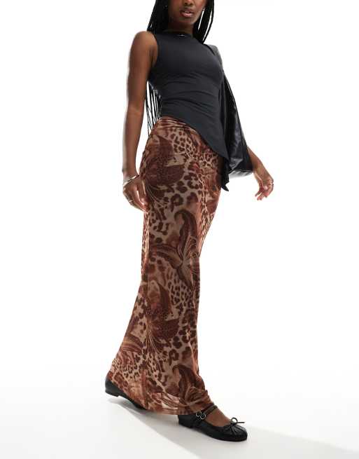 ASOS DESIGN - Jupe longue et fluide en tulle à imprimés fleuri et léopard - Marron