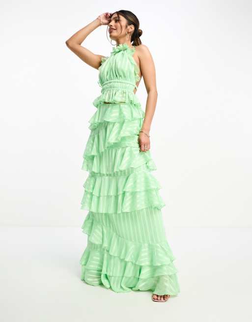 ASOS DESIGN - Jupe longue habillée d'ensemble en satin rayé à volants - Vert