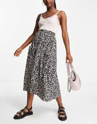 ASOS DESIGN - Jupe mi-longue boutonnée avec poches - Imprimé fleurs noir et blanc