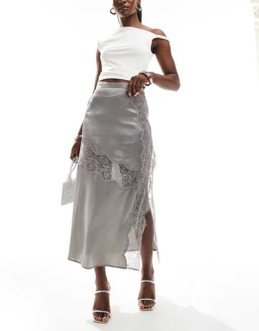 ASOS DESIGN - Jupe mi-longue en satin à empiècements en dentelle - Argenté