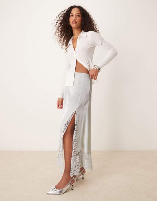 ASOS DESIGN - Jupe mi-longue en satin et dentelle à ourlet mouchoir - Argenté