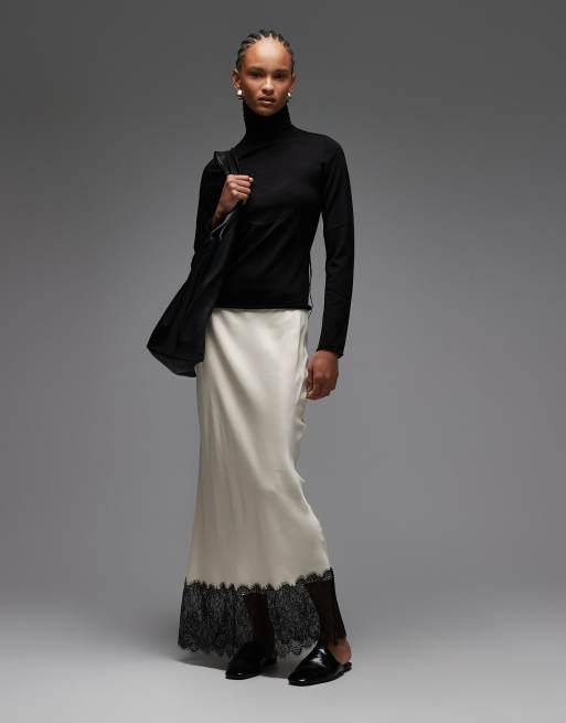ASOS DESIGN - Jupe mi-longue satinée coupée en biais avec bord en dentelle - Écru