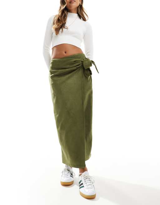 ASOS DESIGN - Jupe portefeuille longue en imitation daim avec détail noué - Kaki