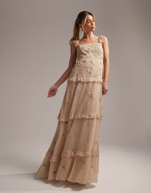 ASOS DESIGN - L'invitée - Robe longue style caraco ornée de broderies - Champagne