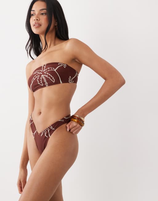 ASOS DESIGN - Logan - Bas de bikini échancré en V à imprimé palmiers - Chocolat