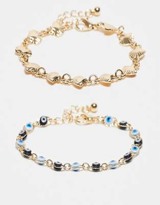 ASOS DESIGN - Lot de 2 bracelets à coquillages fantaisie et yeux - Doré