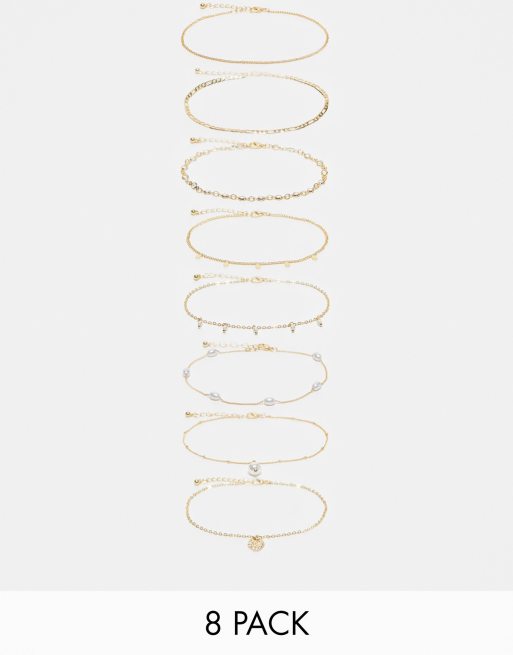 ASOS DESIGN - Lot de 8 bracelets de cheville avec chaînes et perles fantaisie - Doré