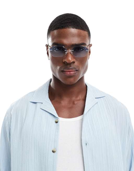 ASOS DESIGN - Lunettes de soleil rectangulaires arrondies à monture invisible en métal argenté et verres bleus