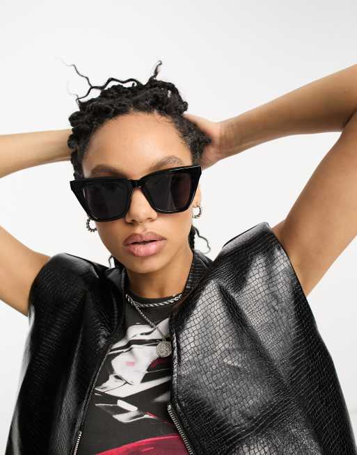ASOS DESIGN - Lunettes de soleil yeux de chat carrées et biseautées - Noir brillant