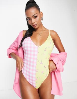 ASOS DESIGN - Maillot 1 pièce à empiècements fleuri et vichy