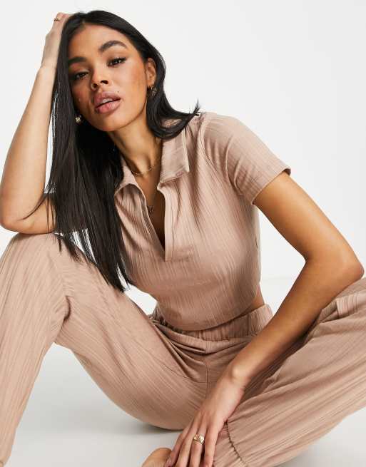 ASOS DESIGN - Mix & Match - Top confort côtelé avec col - Marron