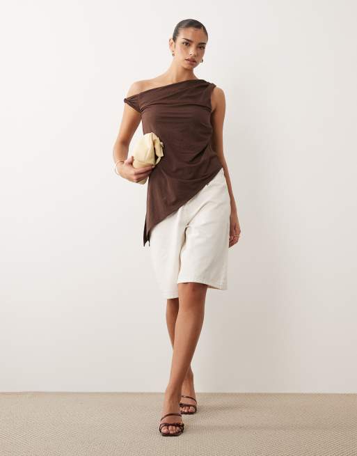 ASOS DESIGN - Mix & Match - Top long imitation lin à ourlet asymétrique - Marron