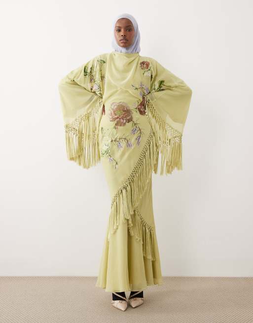 ASOS DESIGN - Modesty - Robe longue style kimono en viscose avec franges et broderies - Vert