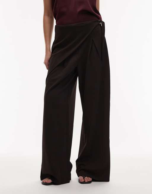 ASOS DESIGN - Pantalon ample ajusté coupe près du corps en sergé avec détail jupe portefeuille - Chocolat