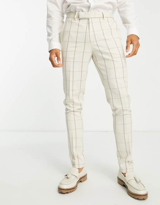 ASOS DESIGN - Pantalon de costume ajusté en lin mélangé à carreaux - Écru et marron