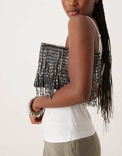 ASOS DESIGN - Pochette à franges métallisées avec perles - Gris acier