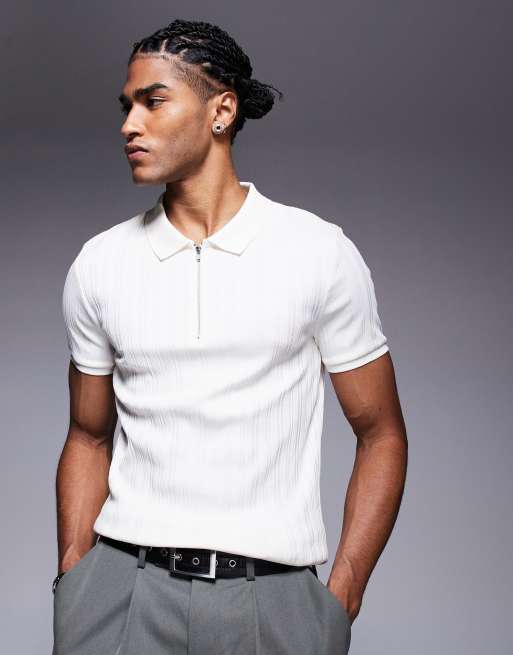 ASOS DESIGN - Polo côtelé moulant texturé à fermeture éclair - Crème
