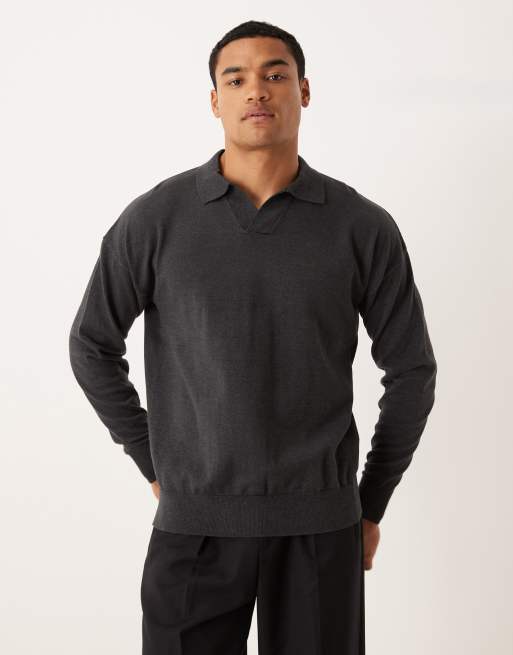 ASOS DESIGN - Polo décontracté en maille avec manches longues et col cranté - Anthracite chiné