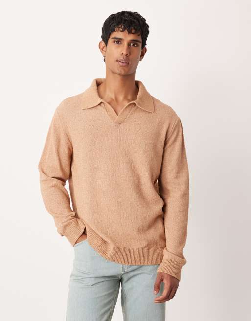ASOS DESIGN - Polo décontracté en maille texturée avec manches longues et col cranté - Marron