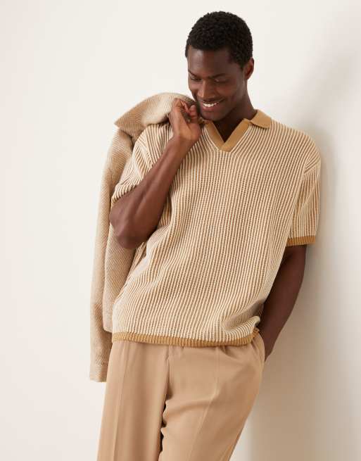 ASOS DESIGN - Polo oversize en maille à côtes plaquées avec col à encoche - Taupe