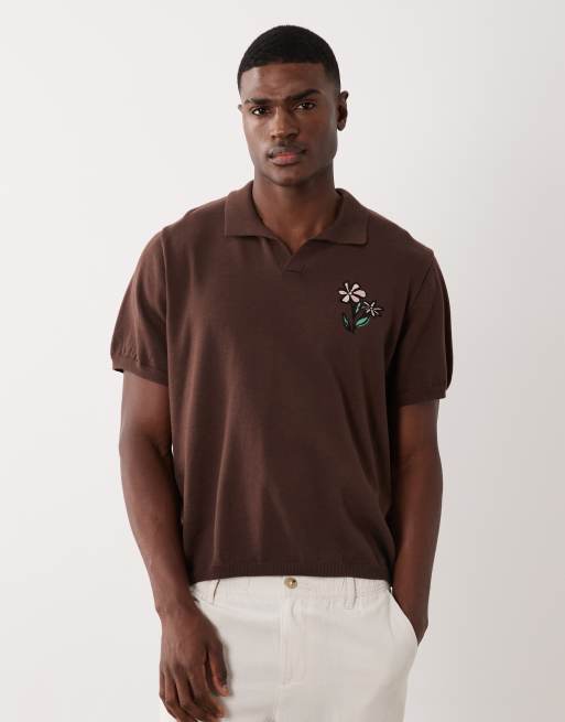 ASOS DESIGN - Polo oversize en maille à manches courtes avec broderie fleur et col cranté - Marron.