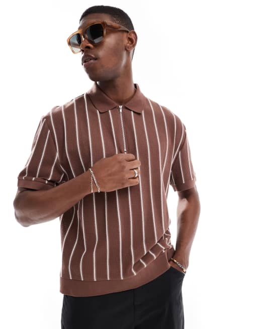 ASOS DESIGN - Polo rayé coupe carrée décontractée à demi-zip - Marron/blanc