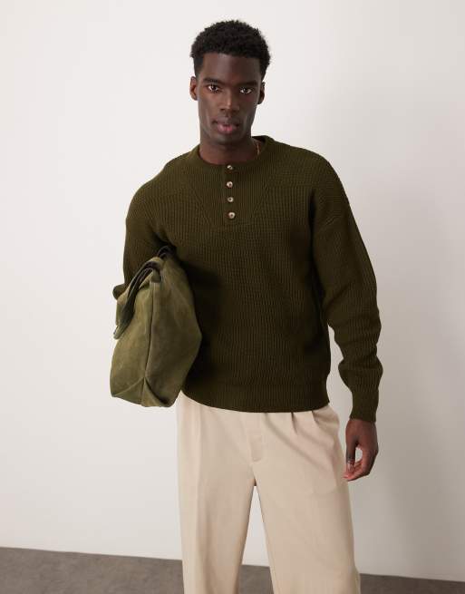 ASOS DESIGN - Pull décontractée en maille à col boutonné - Vert foncé